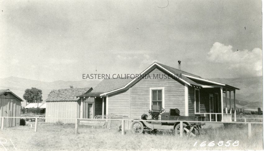 B&W glossy print: house with wood siding and composite roof, front porch, 2 outbuildings, early model car