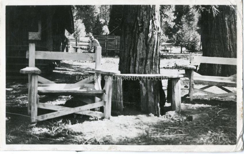 Sepia glossy print: 2 crudely built wooden chairs with crude table built around a tree trunk; men and buildings in background