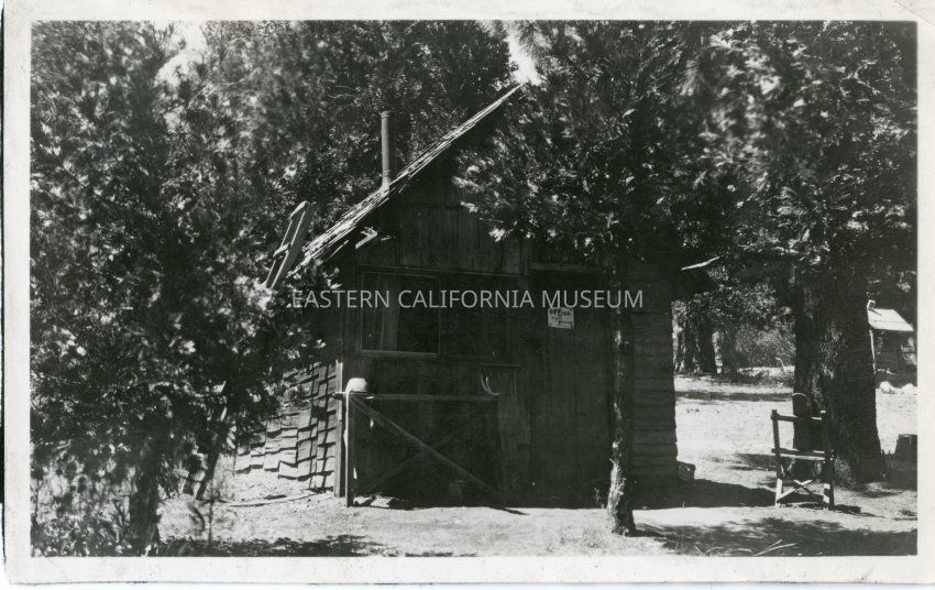 B&W glossy print: cabin with "Office" sign by front door; old wooden ladder up against cabin
