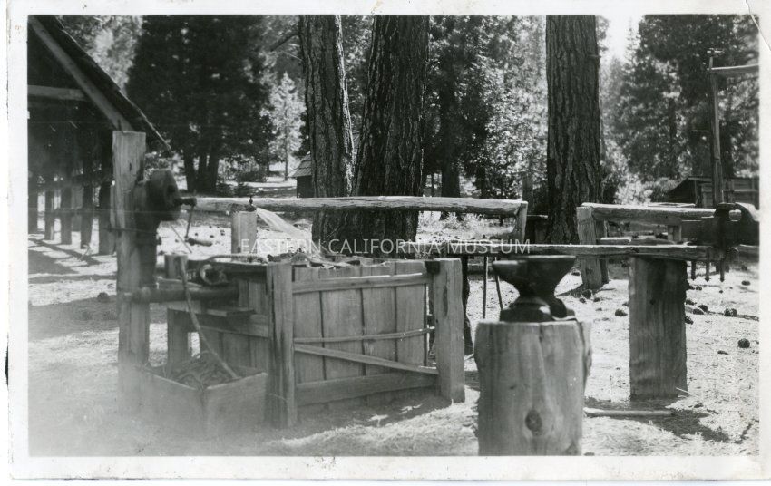 B&W glossy print: anvil (possibly a place where a blacksmith worked) horse barn on left, water faucet turned on - hitching posts for horses