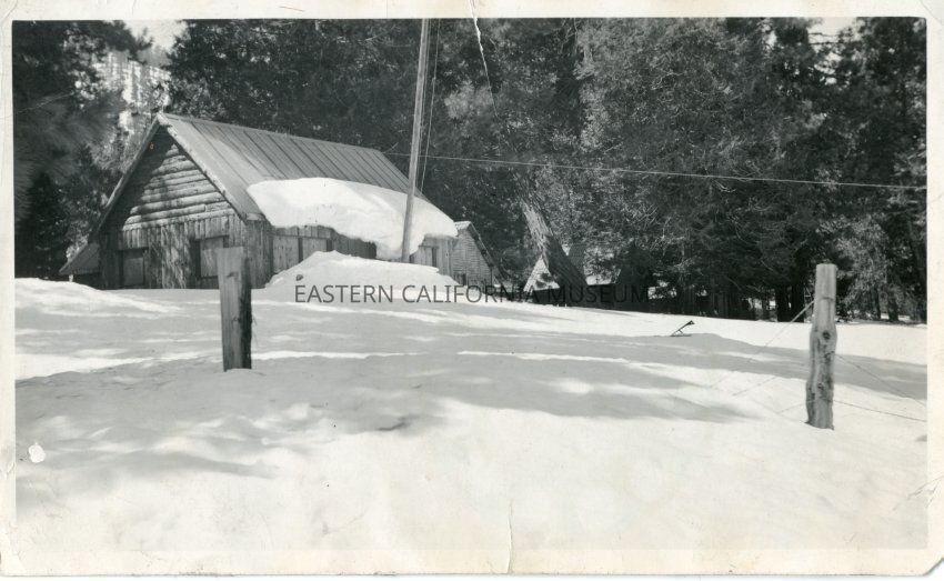 B&W glossy print: wooden cabin, appears to have been closed up for the winter; heavy snow all around, flagpole in front, 2 outbuildings, electrical wire(?)