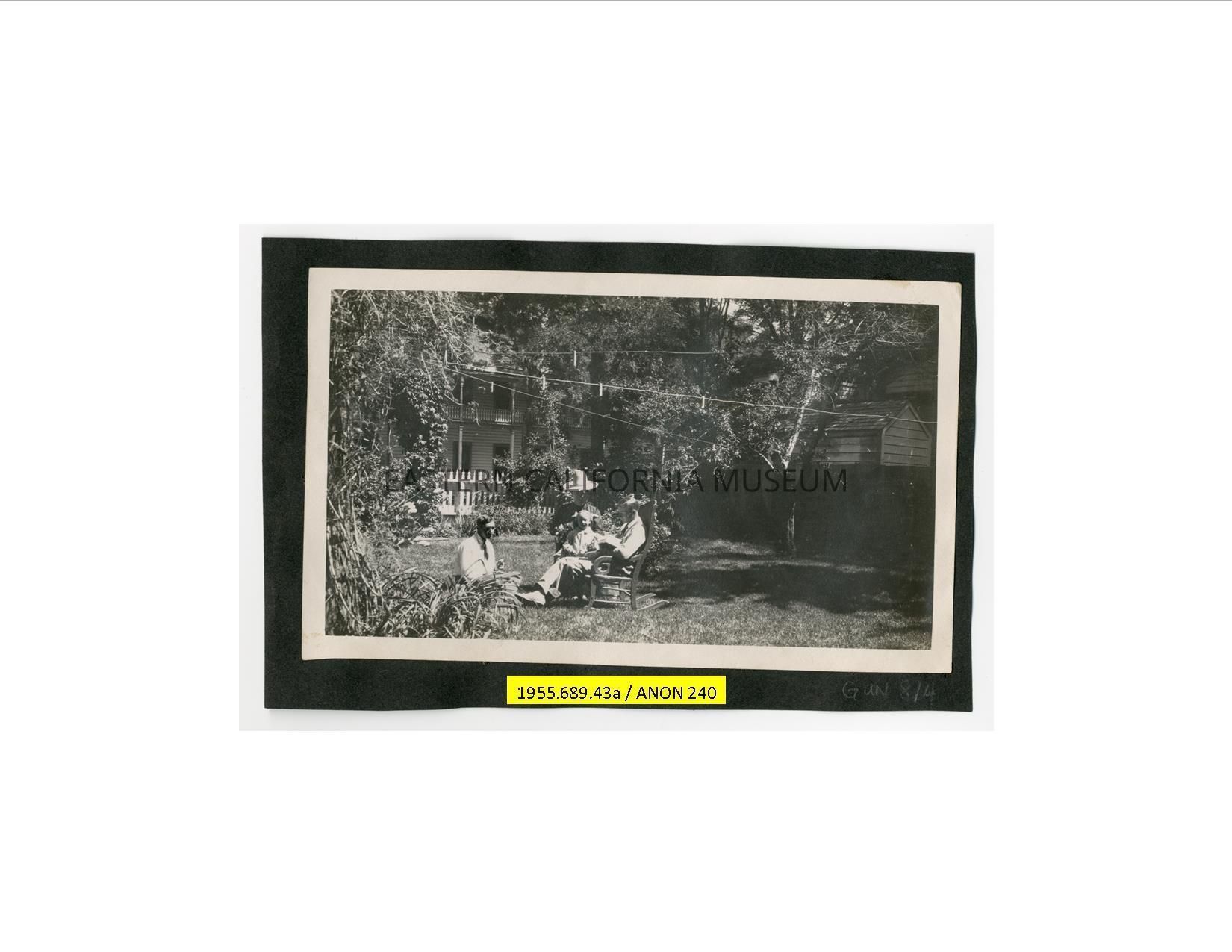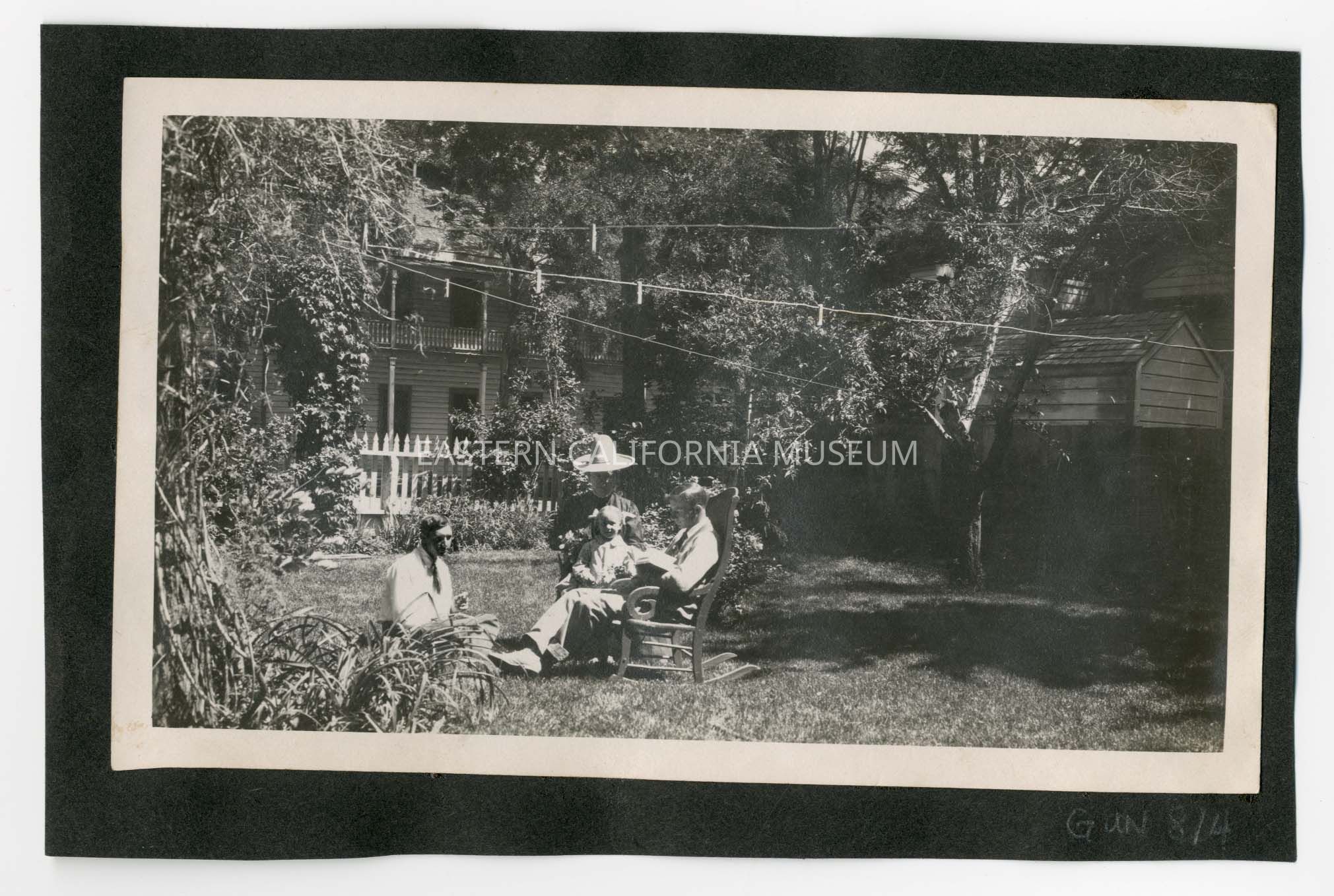 Photo of four people sitting in a grassy lawn. There are several clotheslines in the foreground and a two story building in the background that is likely a hotel. Location may be the Shepherd house in Independence.