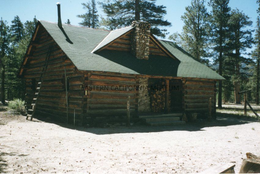 Color matte print: old log cabin with newer composite roof; front rock chimney