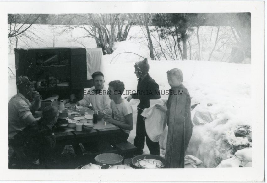 B&W glossy print: six people eating around a picnic table, deep snow surrounds them, campground cabinet filled with supplies