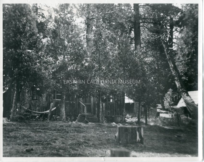 B&W matte print: old wood cabin with 2 other cabins in background, hammock hanging in front, heavily wooded area