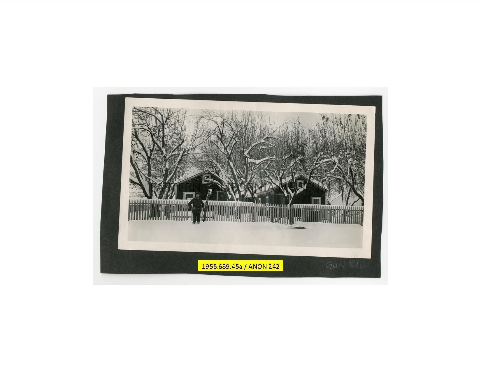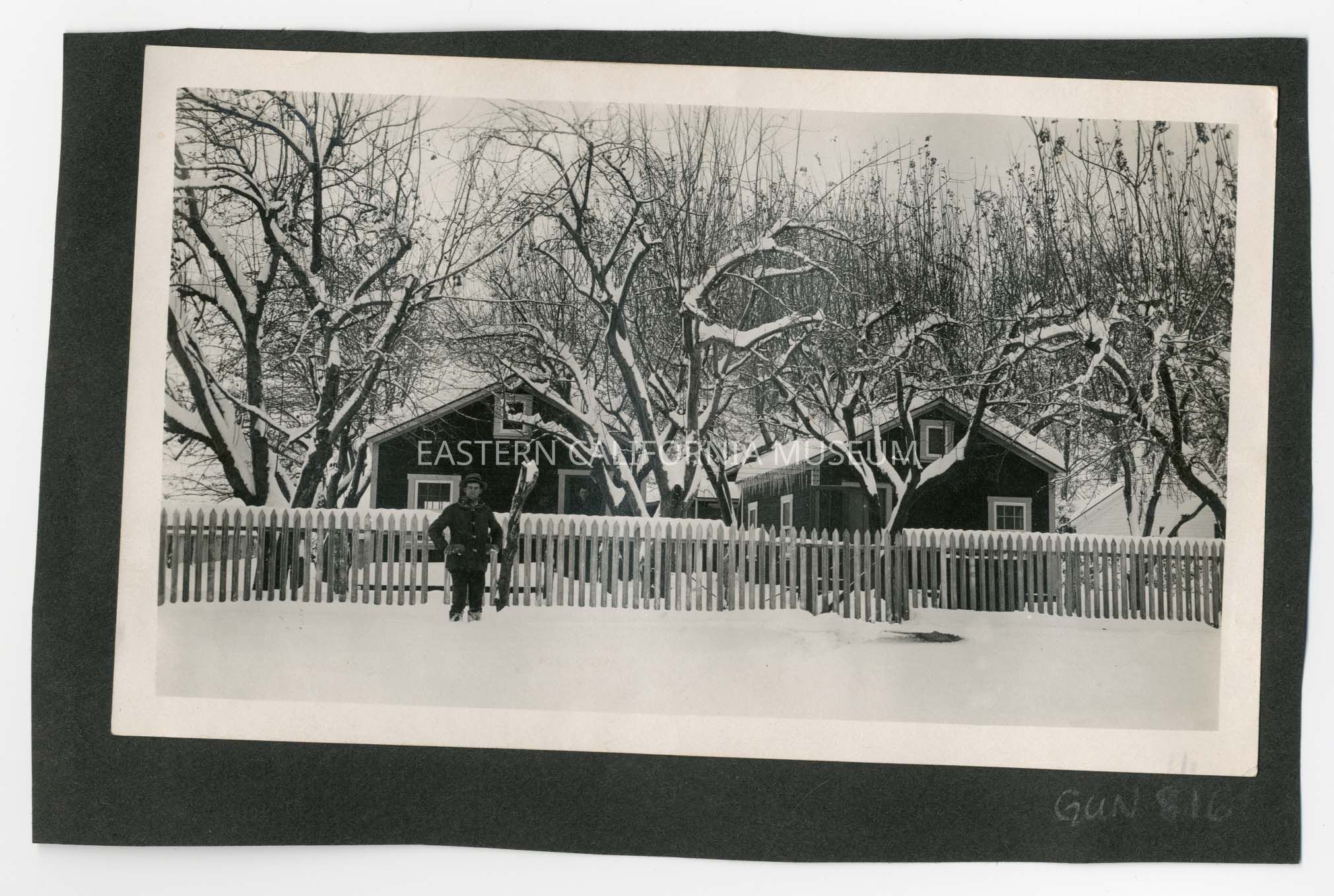 Photo of a man standing in front of a white picket fence, two houses, and a row of trees. Everything is blanketed in snow and there are icicles hanging from the roof.
