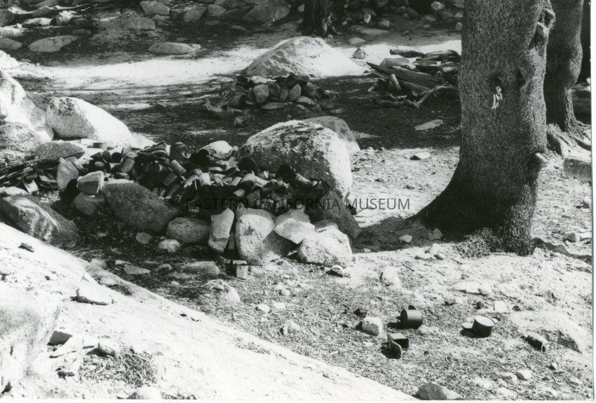 B&W glossy print: rock campfire ring filled with charred cans, other trash