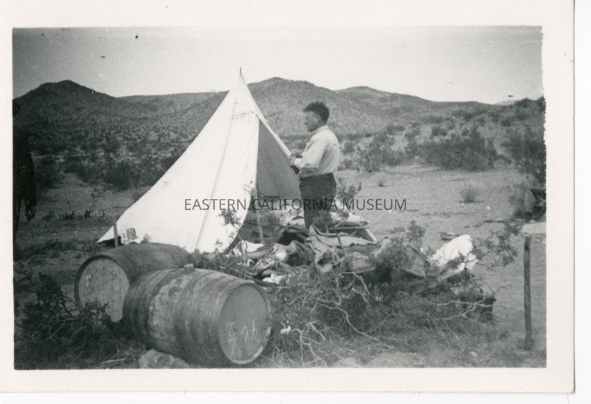 B&W glossy print: man standing in front of a center pole tent