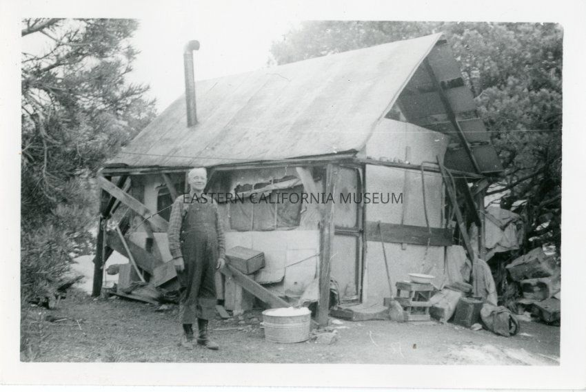 B&W glossy print: man in overalls standing in front of cabin, washtub on his left