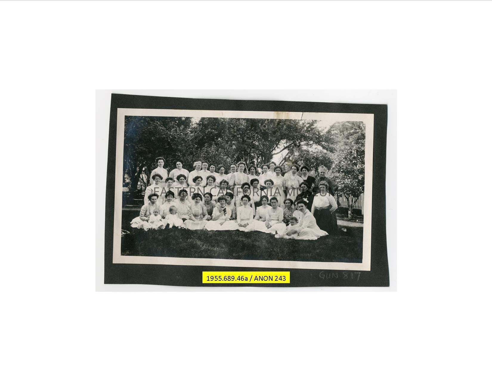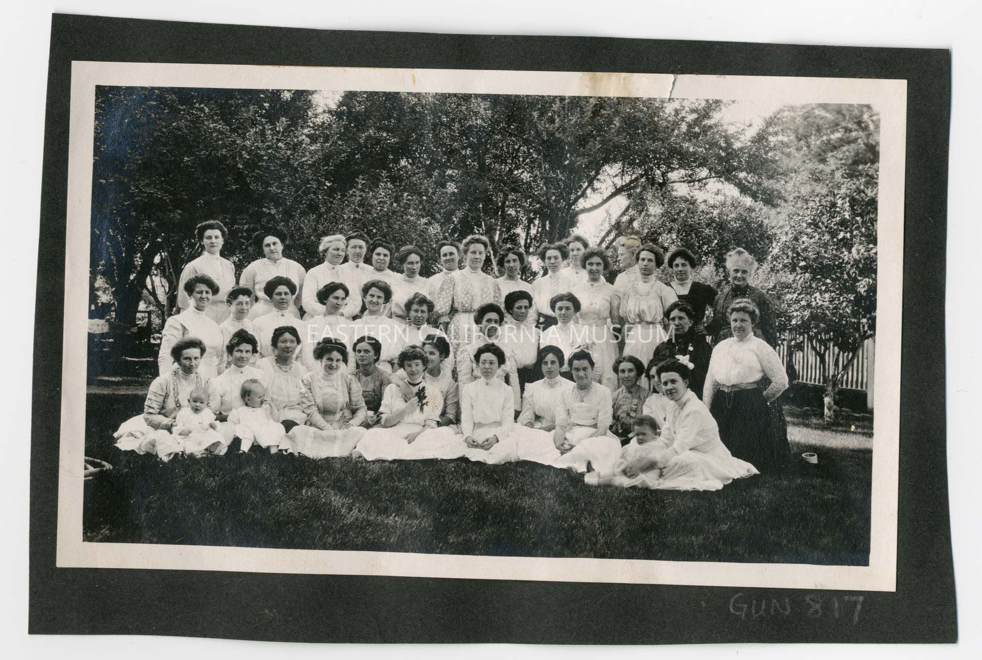 Photo of a large group of women in white dresses posing on a grassy lawn. There appear to be around 40 women and three babies. The occasion of this event was a lawn party given by Mrs. H. A. Van Norman and Mrs. C. A. Van Norman on June 30, 1912. Taken at Mrs. H. A. Van Norman's home at Independence, CA. Same image as 1975.58.66.