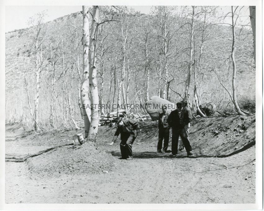 B&W glossy print: 4 men standing on a dirt road in a grove of aspen trees