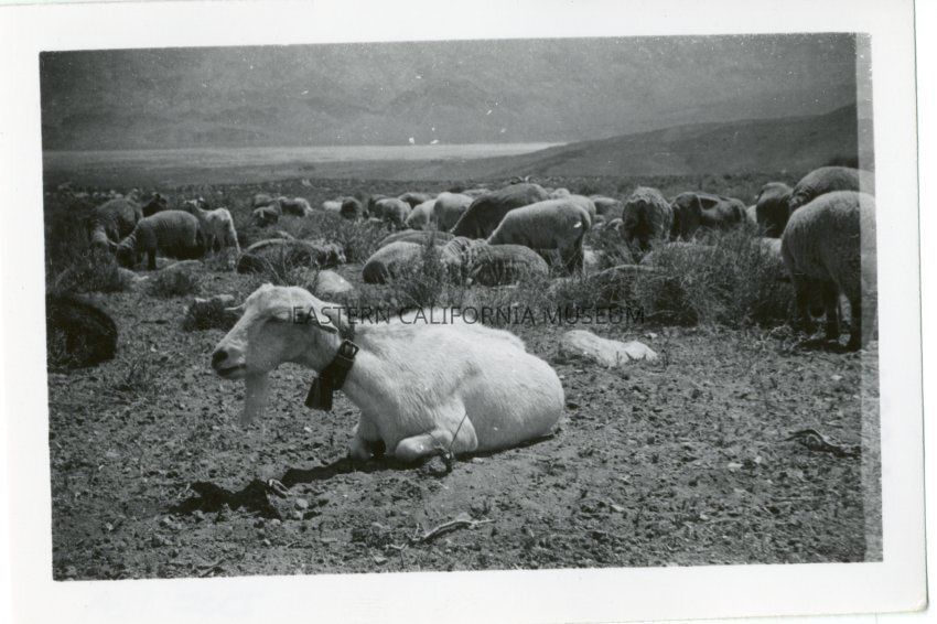 B&W glossy print: close-up of one sheep with flock in background
