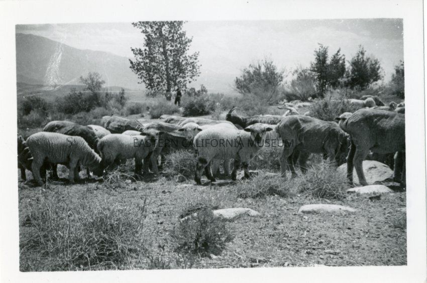 B&W glossy print: flock of sheep, 2 goats, herder in background