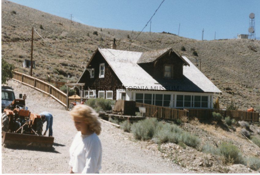 Backside text reads: This building was the best preserved, at Cerro Gordo. Jodi & Mike have repaired it and made into a lovely home - Cerro Gordo - 1986-Aug.
