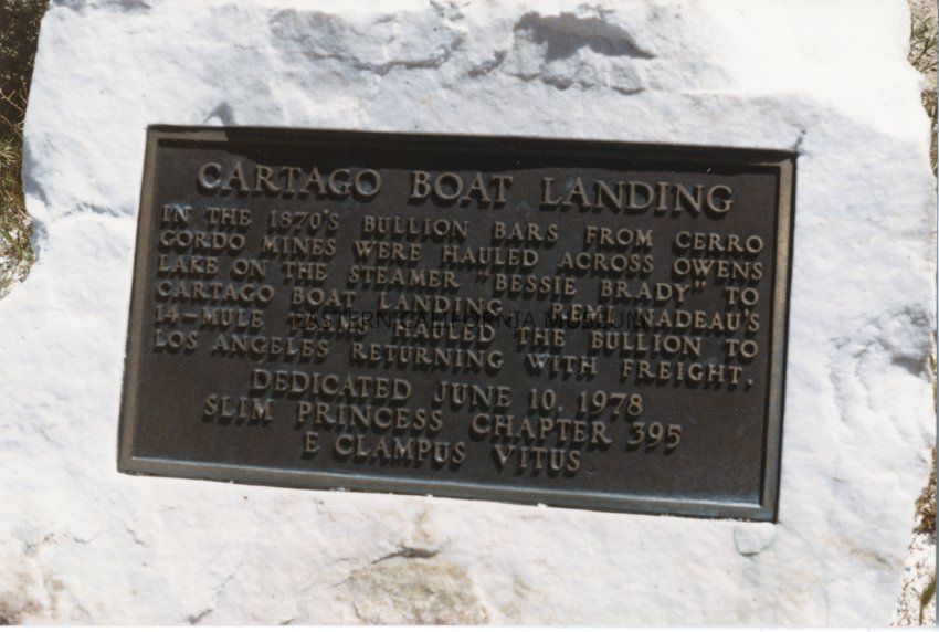 Backside text reads: plaque - Cartago boat landing 1986 E. Stewart