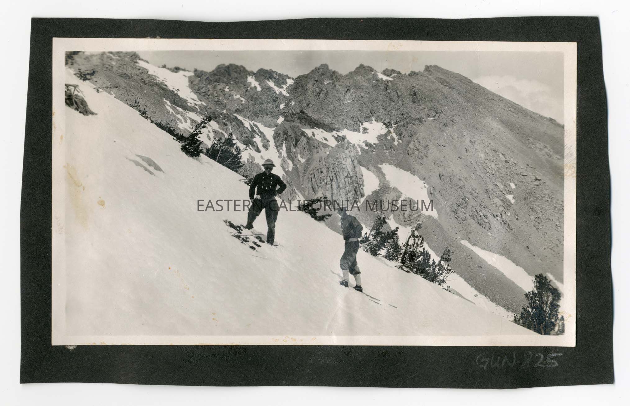 Photo of two men on skis or snowshoes ascending a snowy scope. The location has been identified as the Kearsarge Trail.