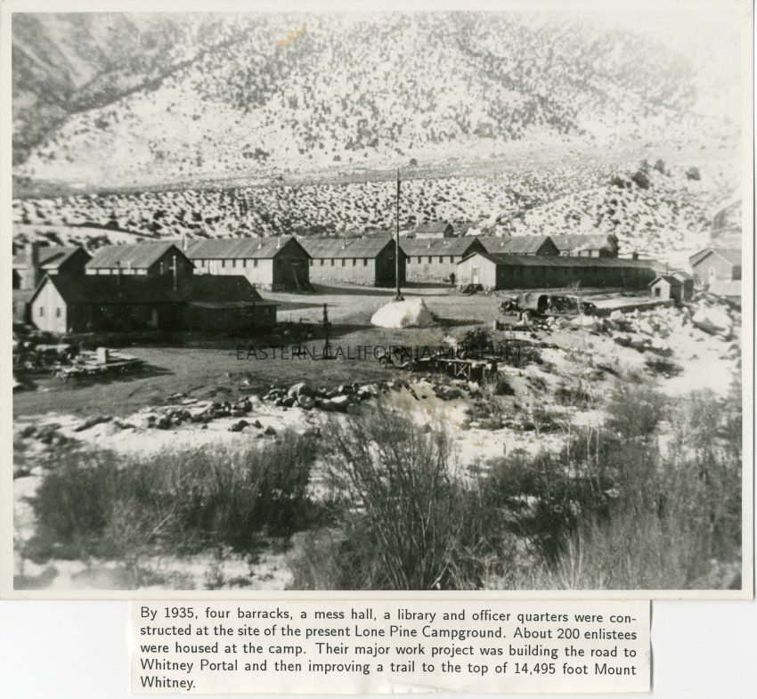 Accompanying paper: By 1935, four barracks, a mess hall, a library & officer quarters were constructed at the site of the present Lone Pine Campground. About 200 enlistees were housed at the camp. Their major work project was building the road to Whitney Portal and then improving a trail to the top of 14,495 foot Mount Whitney.