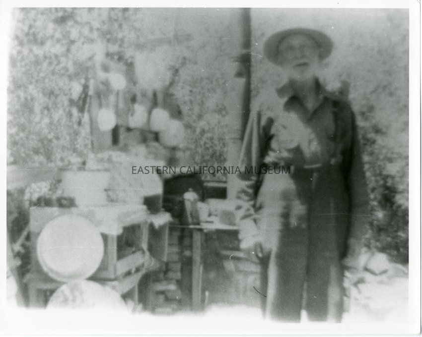 B&W glossy print: man standing next to what appears to be an outdoor kitchen ; photo in with other Art Hess/ Crestview photos