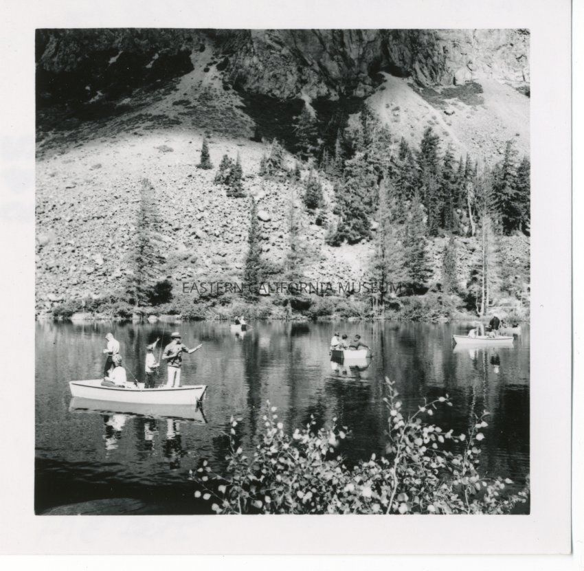 B&W glossy print: 4 boats with fishermen on a mountain lake