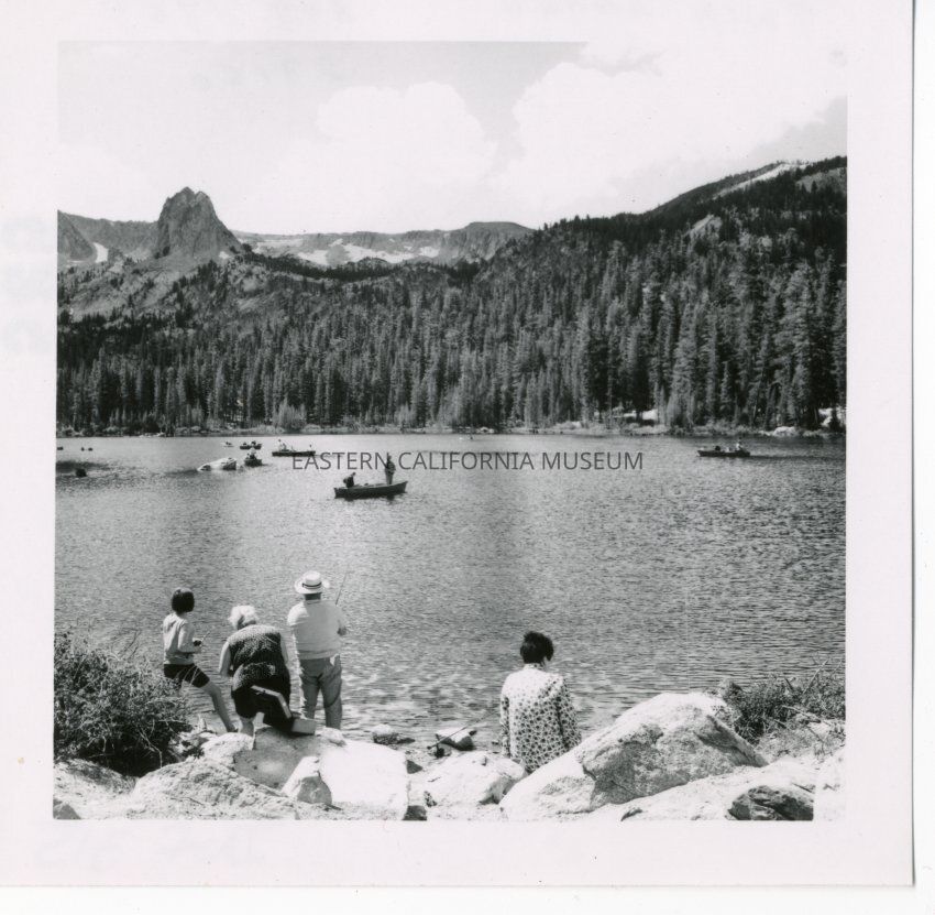 B&W glossy print: fishermen at possibly Lake Mayme in the Mammoth Lakes area; Crystal Crag in the background