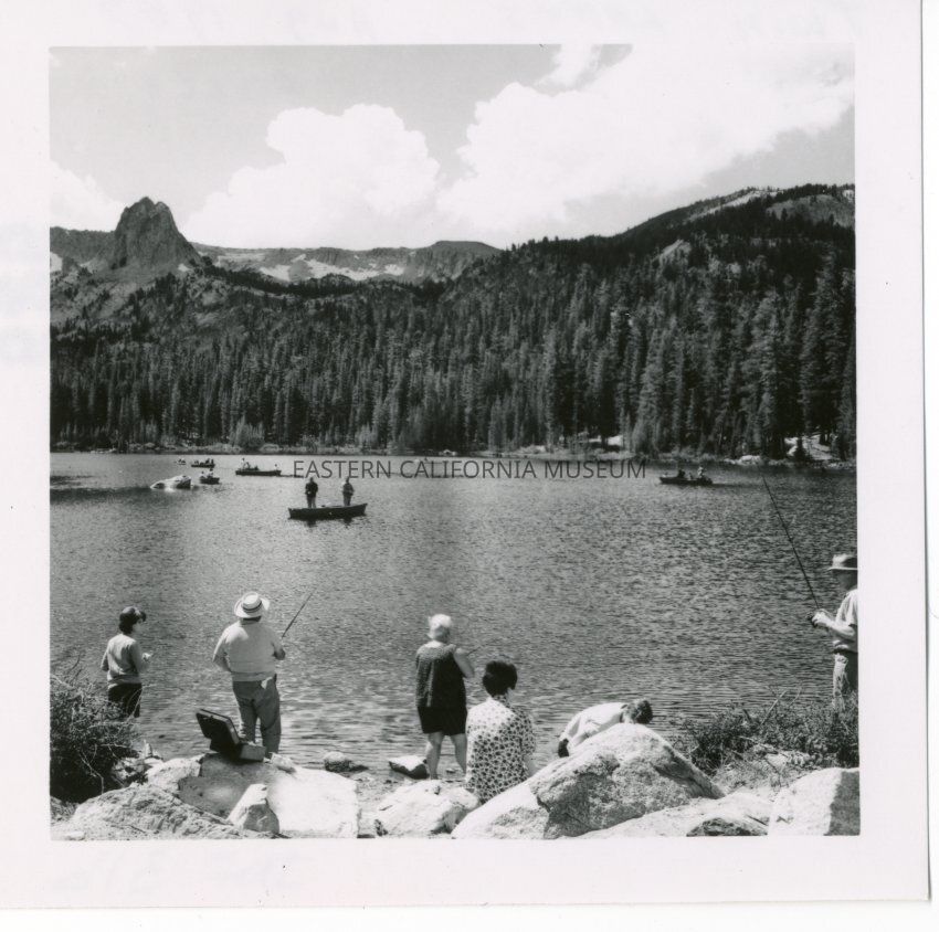 B&W glossy print: fishermen at Lake Mayme(?), Mammoth Lakes area, Crystal Crag in background