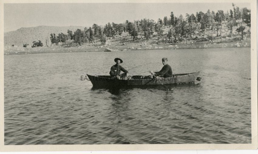 B&W matte print: 2 men in row boat on a lake with fishing poles