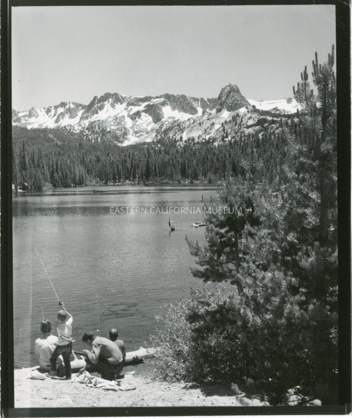 B&W glossy print: family fishing from shore on Lake Mayme, Crystal Crag in background