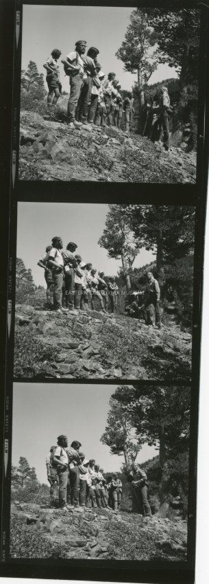 B&W glossy contact strip of 3 prints: all prints showing ranger talking with a crew