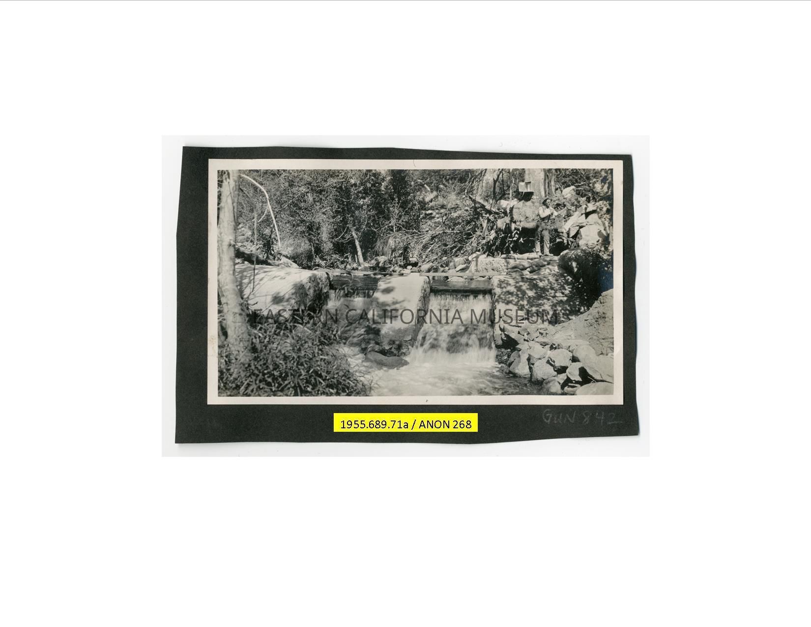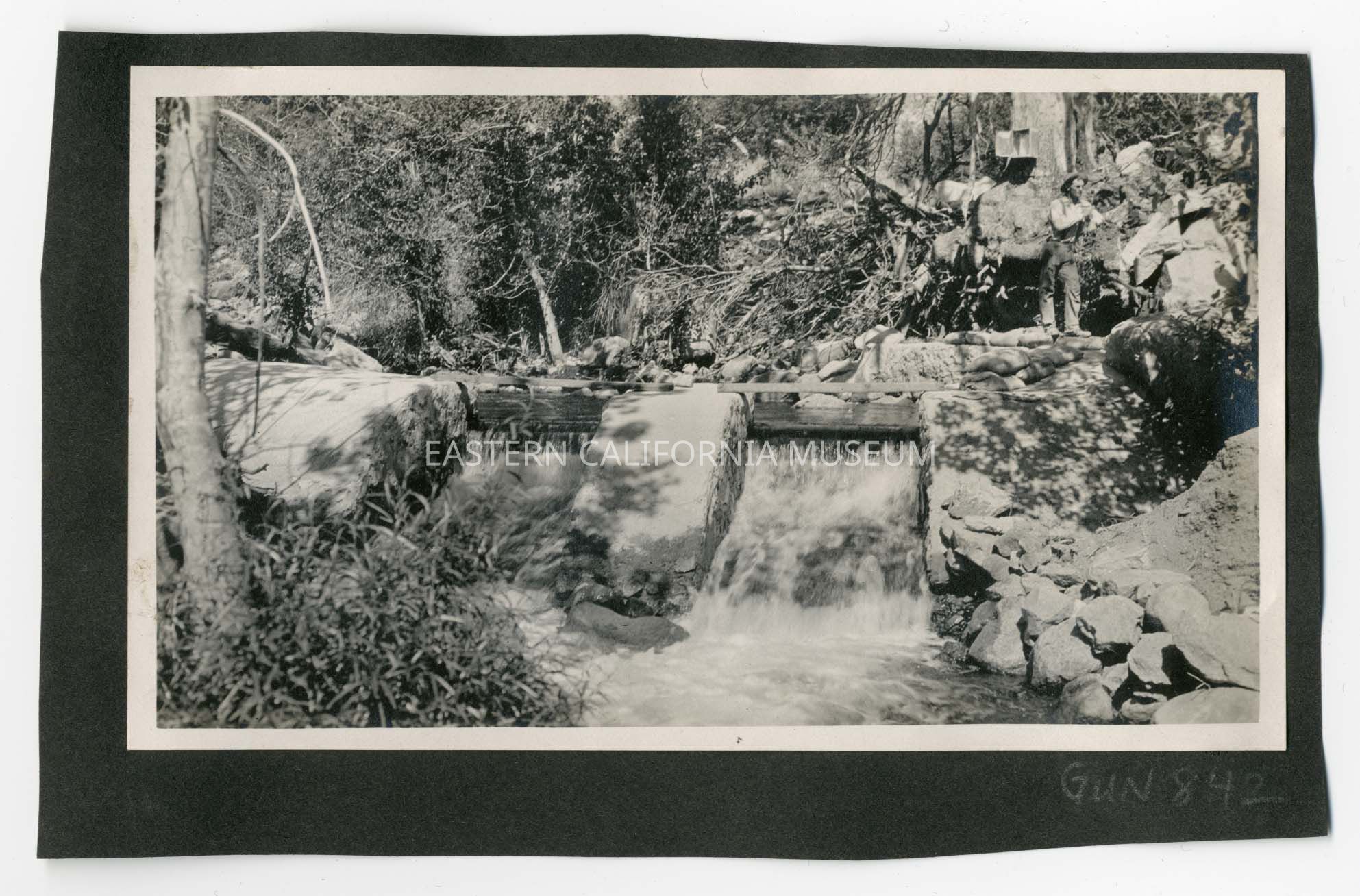 Photo of a man standing on one side of a dammed stream. The dam appears to be constructed of stones and concrete/cement. Water is flowing from two slots in the dam.