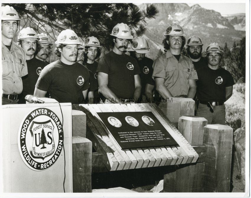 B&W glossy print: fire crew at dedication for plaque installed at Convict Lake (near Mammoth Lakes), commemorating the drowning deaths of 7 people circa 1991