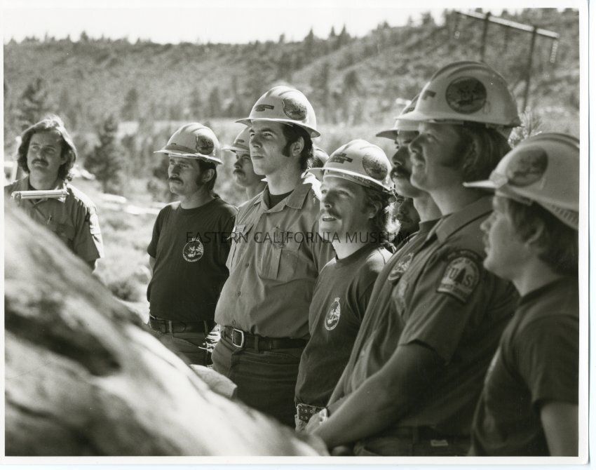 B&W glossy print: fire crew at dedication for plaque commenorating the drowning deaths of 7 people at Convict Lake, near Mammoth Lakes circa 1991