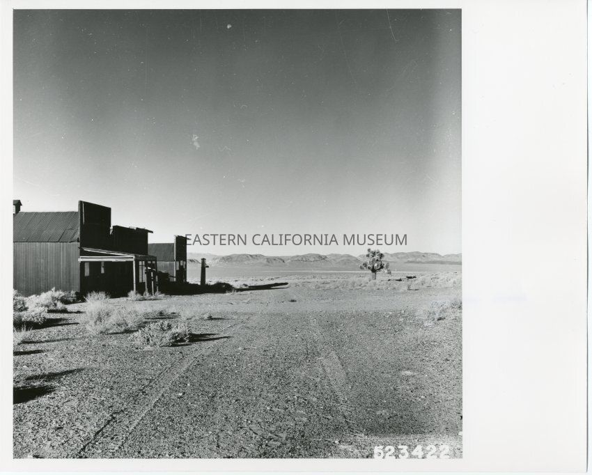 Abandoned buildings in Gold Point, Nevada. Joshua Tree in background. Taken by Rocky Rockwell 10/29/75. (Date submitted to library)