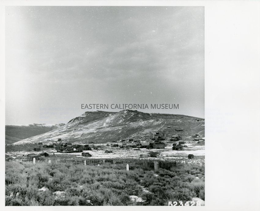 View of Bodie, California from "Boot Hill". Activity at Bodie peaked after most other mining districts played-out. Bodie had its own bank, with a walk-in vault, a school, stores, churches and electric power generated at Green Creek on the Toiyabe N.F. to the west. The Bodie and Benton Rairoad hauled wood for buildings, mine timbers and fuel from the Inyo N.F. on the south. And gold and passengers to a stagecoach connection with the outsdie world. Take by Rocky Rockwell 10/29/75 (Date submitted to Library)