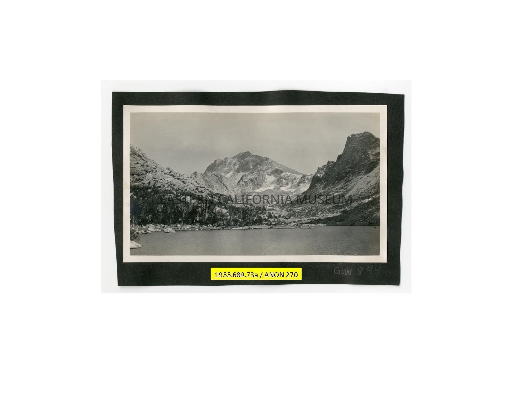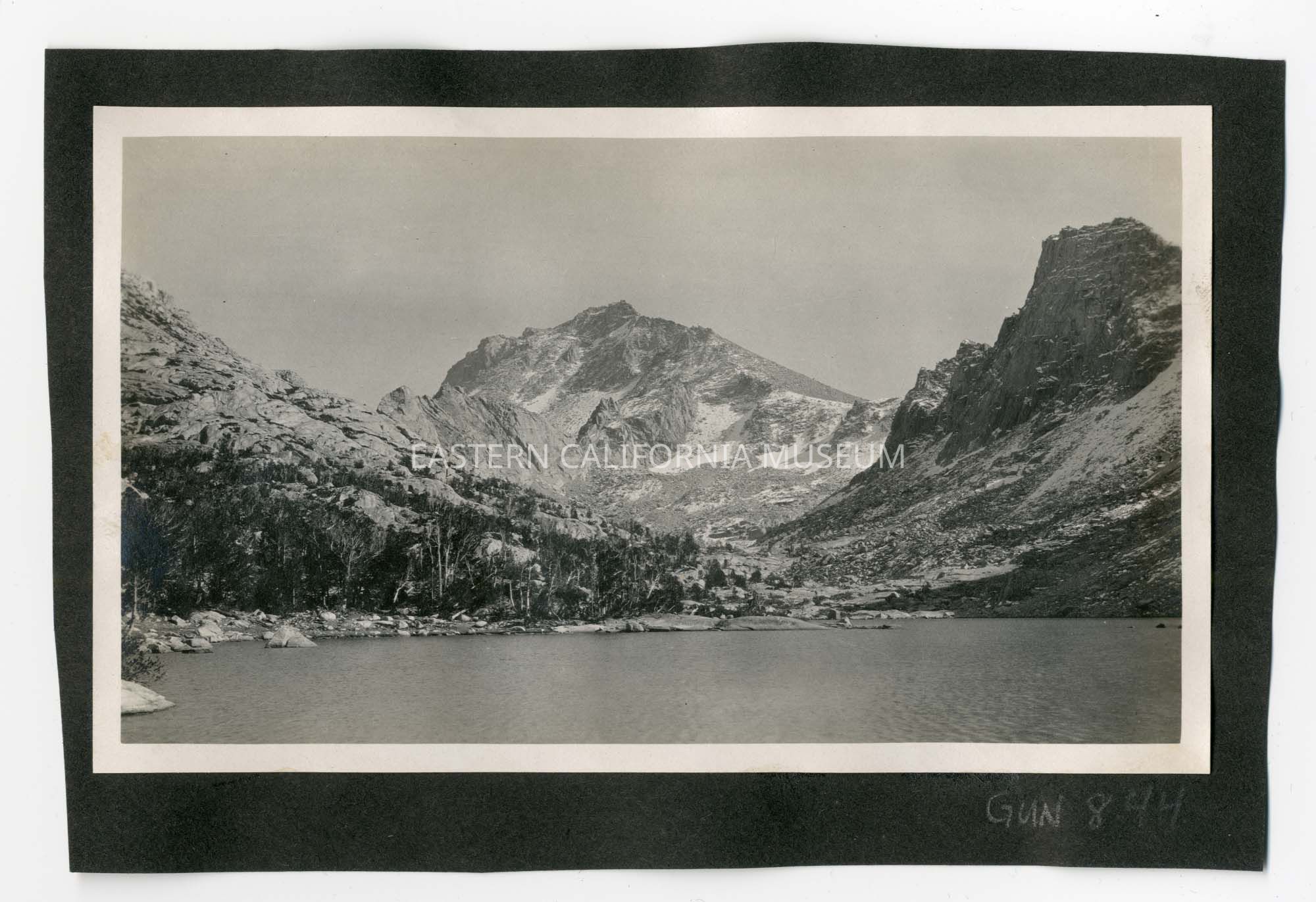 Photo of a mountain lake and peak. They have been identified as Kearsarge Lake and University Peak.