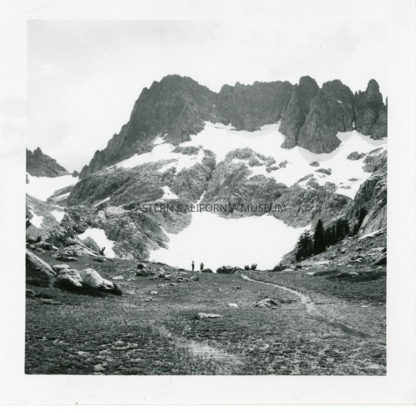 B&W glossy print: high sierra trail toward glacier, 2 hikers