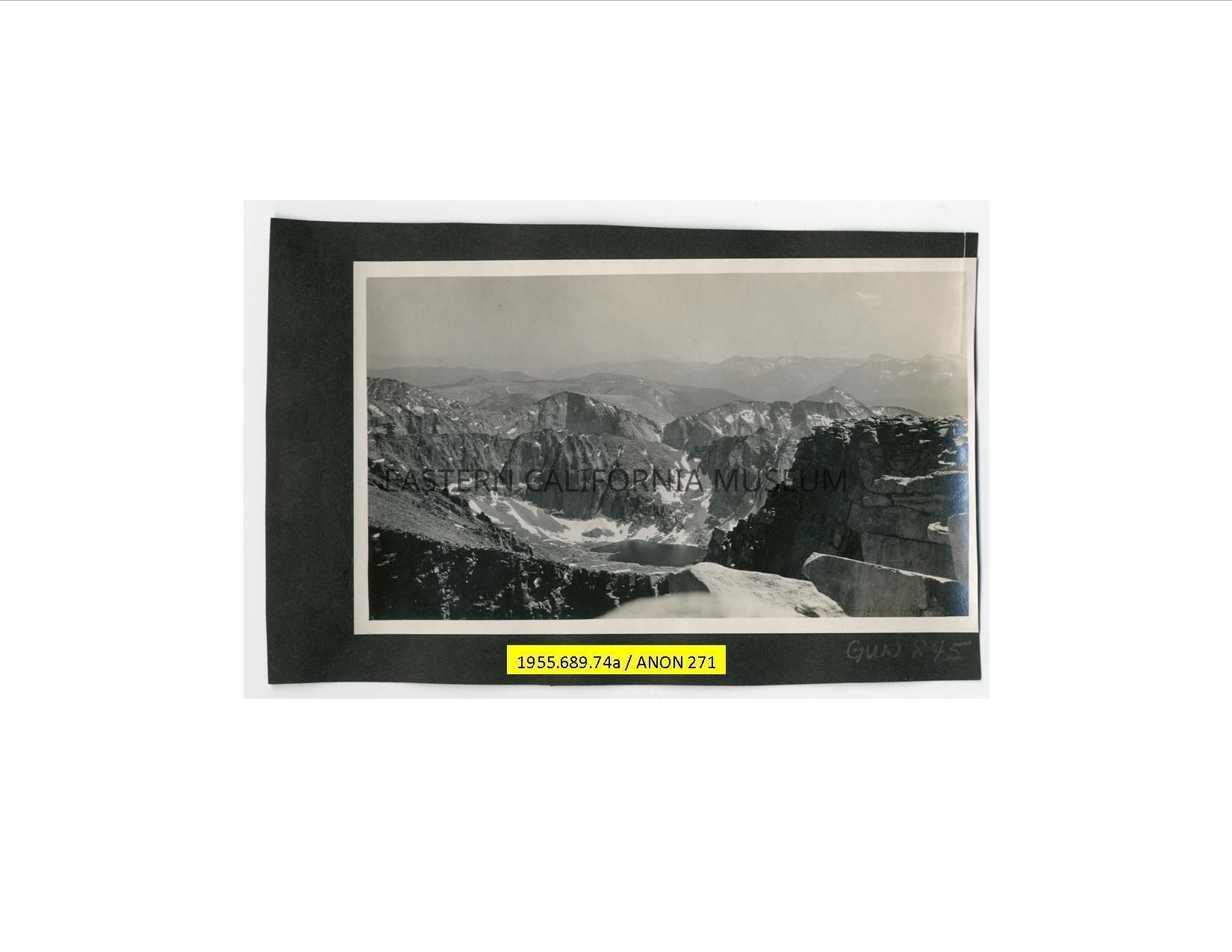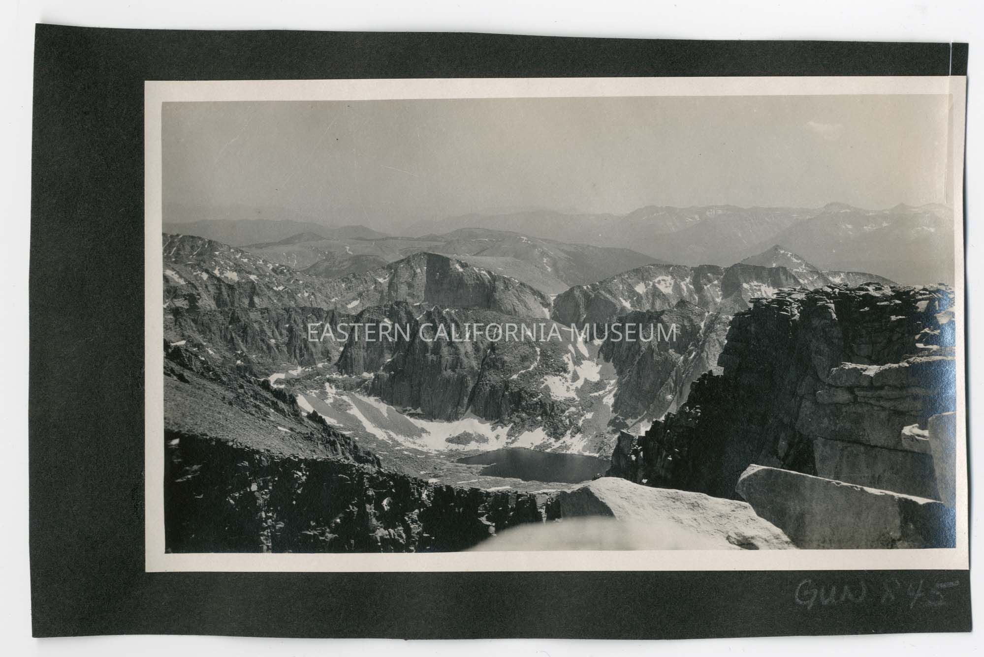 Photo of a barren mountain landscape and lake taken from a high elevation. The location has been identified as Mt. Whitney summit.