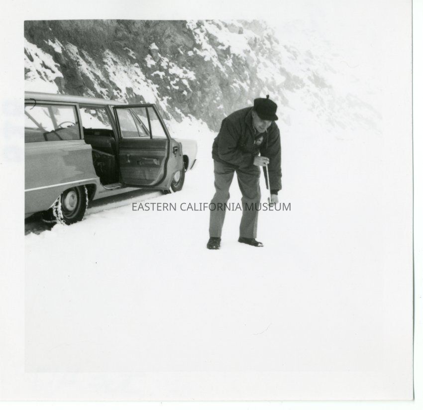 B&W glossy print: man measuring snow on a road