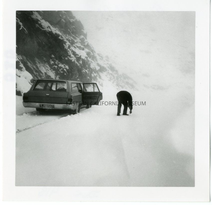 B&W glossy print: man measuring snow on road