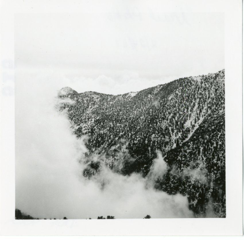 B&W glossy print: wooded mountains partially covered by low clouds