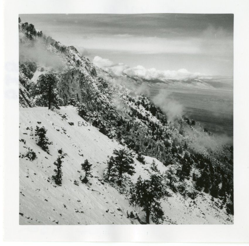 B&W glossy print: snowy mountainside with valley in distance