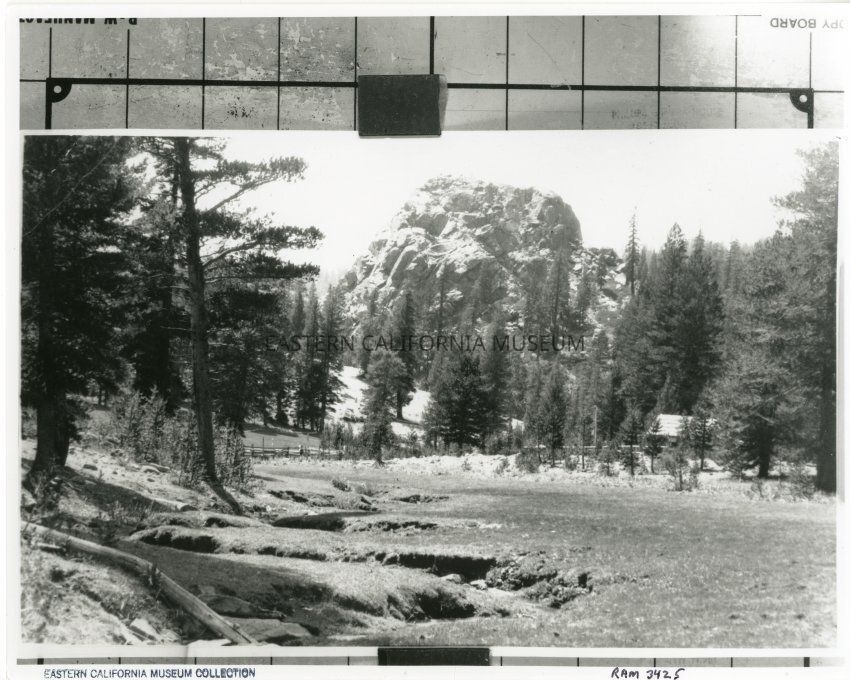 B&W glossy print: meadow with large rock outcropping in background; in with other photos from Golden Trout Wilderness