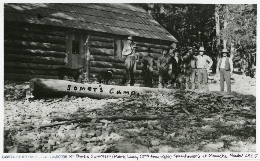 B&W glossy print: 7 men standing in front of log cabin; Rt. Charlie Summers/Mark Lacey (3rd from right) Spainhower's at Monache Meadow : from ECM collection (Lacey collection)