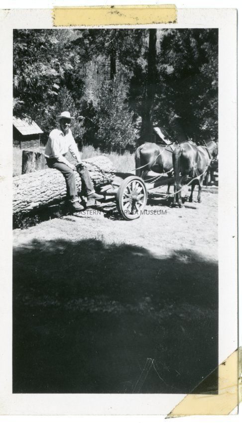 B&W glossy print: man sitting on log being pulled by 2 horses