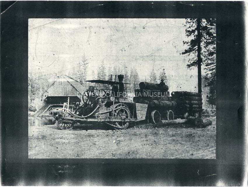 B&W glossy print: reprint of original, on light weight paper - wagon loaded with logs being pulled by engine