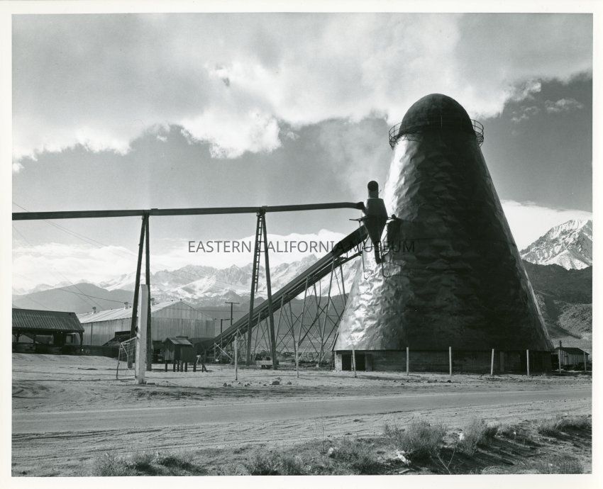 B&W glossy print: Sawmill site, waste burnng furnace