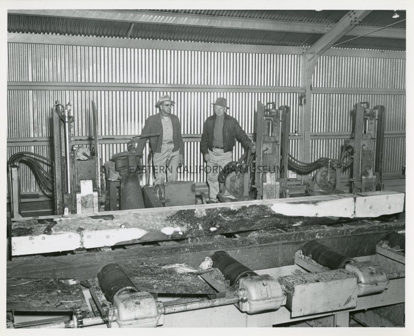B&W glossy print: sawmill site, inside building, men milling timber