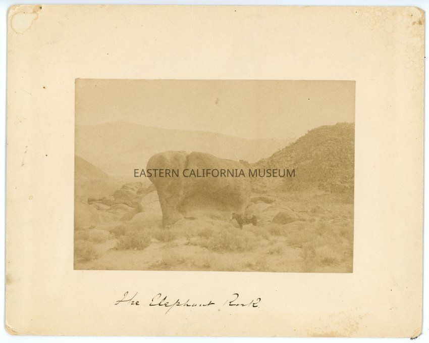 Mounted photograph of Elephant Rock in the Alabama Hills. Saddled horse is also in photo. Written in black ink below photo is, "The Elephant Rock."Collection