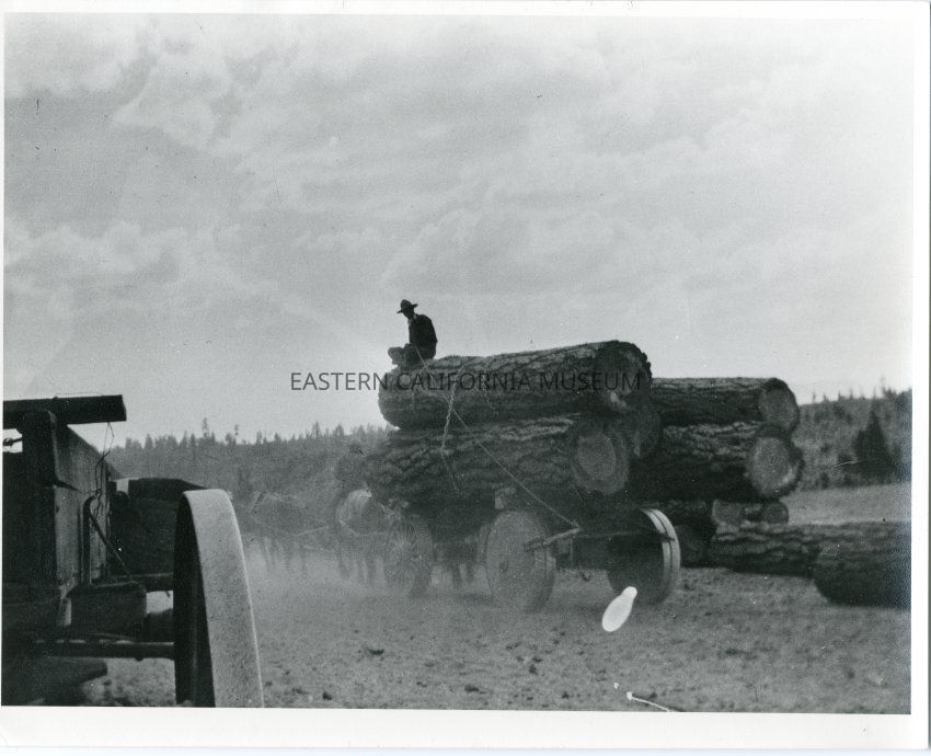 B&W glossy print: man sitting atop load of timber in wagon being pulled by a team of mules