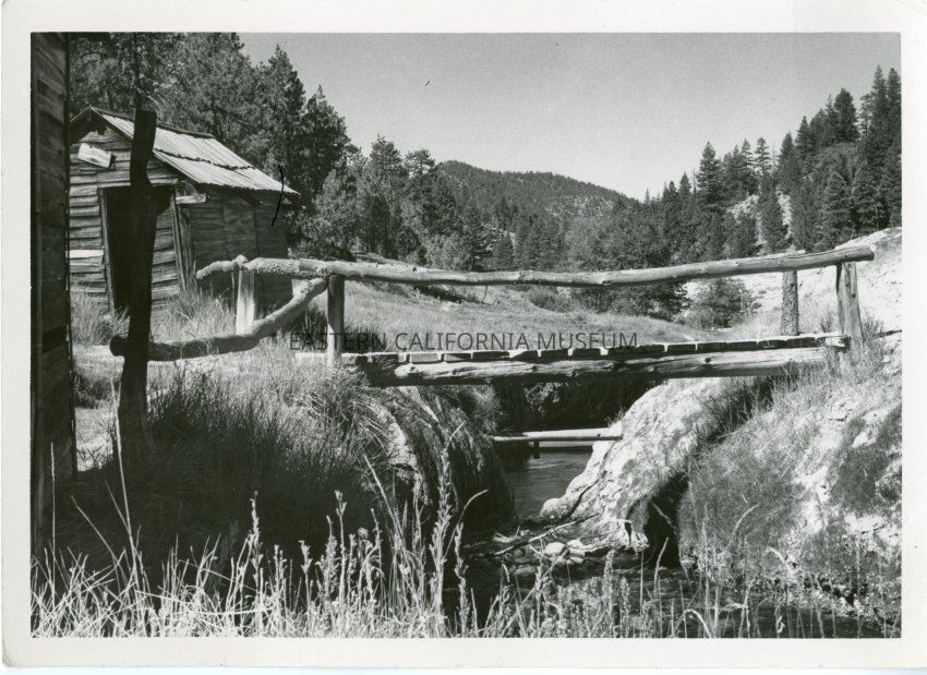 B&W glossy print: mountain stream with small bridge and cabin