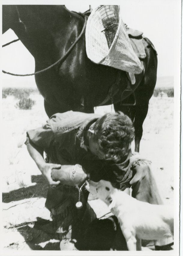 Backside text reads: 2/18-79 Helen took this picture while I was giving our dogs a drink on the talus slope west side of Fish Lake Valley. Helen bough the burden basket from an Indian woman shortly before the picture was taken we still have it in our basket collection. LHB